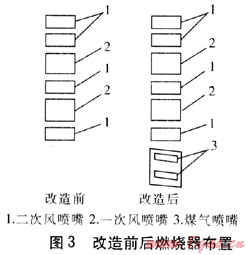 鍋爐原煤粉燃燒器為四角切圓布置,考慮到煤氣燃燒與煤粉燃燒的兼容性和爐內(nèi)空氣動力場的穩(wěn)定性,煤氣燃燒器仍以切圓布置方式為宜。經(jīng)計算,若煤氣燃燒器采用布置在原煤粉燃燒器下的四角切圓燃燒,則要求原煤粉燃燒器下層噴嘴至運行層的間距應(yīng)不小于1000mm,而實際間距僅有700mm,四角切圓方案難以實現(xiàn)。因此,煤氣燃燒系統(tǒng)最終采用六角切圓布置方式,其中4只煤氣噴嘴直接布置在煤粉噴嘴下部,另外2只煤氣噴嘴布置在左右側(cè)墻的中心,主煤氣輸送管道進入鍋爐房后分為兩根煤氣分管道布置于鍋爐兩側(cè),每根分管道再各分出3根支管連接煤氣燃燒器,見圖2。為擴大切圓直徑,增加受熱面的吸熱量,降低火焰中心位置,煤氣燃燒器出口軸線分別在原煤粉燃燒器噴嘴出口軸線方向上水平向外偏轉(zhuǎn)20°,向下偏轉(zhuǎn)20°。改造前后燃燒器布置見圖3。綜合考慮低熱值煤氣著火與燃燒的穩(wěn)定性及火焰的長度,煤氣燃燒器采用雙通道煤氣噴嘴,具有部分預(yù)混作用,噴嘴出口煤氣流速約32m/s,空氣流速約35m/s[4~7]。