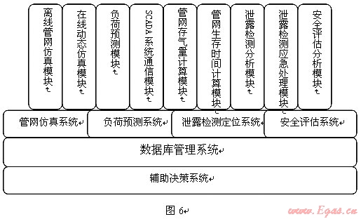 輔助決策系統(tǒng)一辦包含管網(wǎng)仿真系統(tǒng)、負荷預(yù)測系統(tǒng)、泄露檢測定位系統(tǒng)、安全評估系統(tǒng)等系統(tǒng)組成,輔助決策系統(tǒng)結(jié)構(gòu)見圖6: