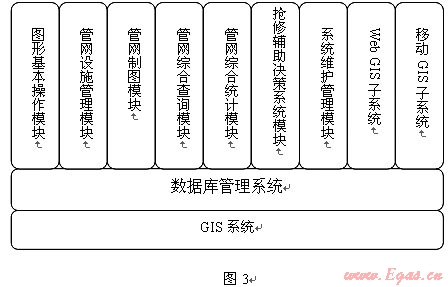 GIS系統(tǒng)主要由圖形基本操作模塊、管網(wǎng)設(shè)施管理模塊(設(shè)備臺賬管理)、管網(wǎng)制圖系統(tǒng)、管網(wǎng)綜合查詢系統(tǒng)模塊、管網(wǎng)綜合統(tǒng)計模塊、搶修輔助決策系統(tǒng)模塊、系統(tǒng)維護管理模塊、WEB GIS子系統(tǒng)、移動GIS子系統(tǒng)(PDA)等組成。功能模塊見圖3: