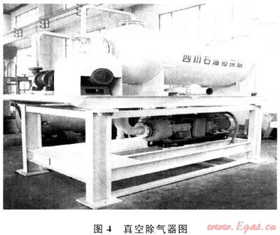 在鉆井作業(yè)過程中,地層中的氣體往往會侵入到鉆井液中,形成大量的大小不等的氣泡。在密閉系統(tǒng)中,四相分離器只能清除體積較大的氣泡,對于溶解在鉆井液中的微小氣泡卻難以清除,而這些微小氣泡會造成鉆井液密度降低、黏度升高、流動性變差,從而影響了鉆井液的性能。為了維護鉆井液的性能,在密閉系統(tǒng)中配置密閉式鉆井液緩沖罐及真空除氣器(圖4)。鉆井液緩沖罐主要作用是使鉆井液流速平穩(wěn)滿足真空除氣器的工作要求。真空除氣器的作用是清除四相分離器無法分離的微小氣泡。川慶鉆探工程公司鉆采工藝技術研究院研制成功的ZCQ2/3真空式除氣器已在塔里木迪那區(qū)塊和川渝地區(qū)鉆井中得到成功的使用[4]。該除氣器用于密閉系統(tǒng)時,需對密封等機構進行防硫改造以滿足密閉系統(tǒng)的要求。