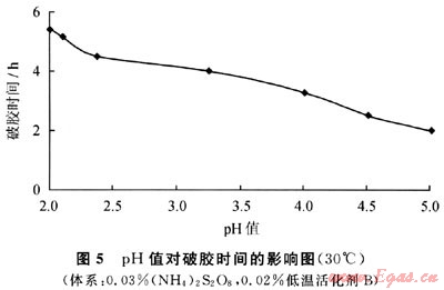 將PAM濃度為0.4%,ZrOCl2為1%的溶液按100:3.5的配比混合,加入相同濃度的氧化還原體系,使用2%HCI將體系pH值調(diào)至不同值,放入30℃水浴測得破膠時(shí)間(圖5)。