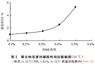 將不同質(zhì)量分?jǐn)?shù)的PAM加入相同的氧化還原體系,并加入調(diào)節(jié)劑A后,與ZrOCl2為1%的溶液按100:3.5的配比混合進(jìn)行交聯(lián),測得在40℃破膠時(shí)間(圖2)。