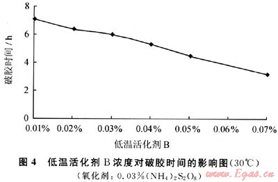 將PAM濃度為0.4%,ZrOCl2為1%的溶液按100:3.5的配比混合,加入不同濃度的低溫活化劑B,加入調(diào)節(jié)劑A,放入30℃水浴測得破膠時(shí)間(圖4)。