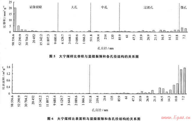在煤層氣排采過程中,當(dāng)儲層壓力、水產(chǎn)量處于連續(xù)穩(wěn)定下降階段時,氣產(chǎn)量仍然呈現(xiàn)出較大的波動,其影響因素是煤層氣的解吸特征,最終受控于煤的孔徑結(jié)構(gòu)。煤中顯微裂隙(壓汞孔徑D>10000nm)和各孔徑(大孔:1000nm<D<10000nm;中孔:100nm<D<1000nm;過渡孔:10nm<D<100nm;微孔D<10nm)的比容積、比表面積的分布是不連續(xù)的(圖5、6),比容積主要分布在顯微裂隙、過渡孔和微孔中,比表面積則以微孔和過渡孔占絕對優(yōu)勢(表1、2)。在煤層氣的解吸過程中,當(dāng)解吸到某一孔徑段時,因孔容、孔表面積的變化導(dǎo)致產(chǎn)氣速率變化,氣產(chǎn)量也呈現(xiàn)波動(盡管氣產(chǎn)量是一個綜合效應(yīng),當(dāng)解吸到某一優(yōu)勢孔徑時氣產(chǎn)量仍然會呈現(xiàn)出強(qiáng)勢)。