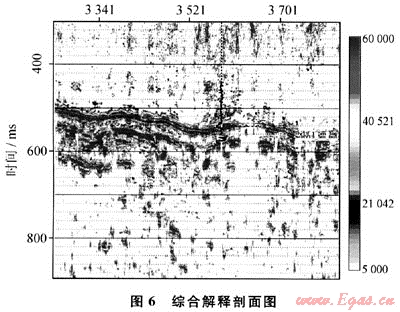 為更好地突出煤層氣AVO異常,把截距、梯度數(shù)據(jù)體進行相減運算,取差值的振幅包絡屬性作圖,獲得綜合解釋剖面圖(圖6)。由于煤層氣的AVO異常特點是截距與梯度符號相反,因此差值增強了與煤層氣富集相關的AVO異常,而削弱AVO反演噪音。截距、梯度差值的包絡屬性,將把頂、底板反射界面相關的同相軸異常合并顯示為同一個同相軸,突出了AVO異常范圍。圖6中沿2條藍線(即5#煤層頂板、底板的位置)的紫紅色位置是煤層氣富集區(qū)。