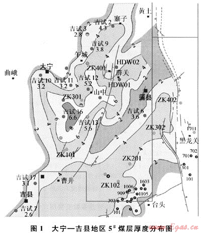 大寧-吉縣地區(qū)位于鄂爾多斯盆地東緣晉西撓褶帶中南段,呈西傾單斜構造。主要含煤地層為下二疊統(tǒng)山西組,含煤層數(shù)有十幾層,其中山西組的5#煤層全區(qū)分布較穩(wěn)定,是煤層氣勘探開發(fā)主要目的層[2~4],煤層埋深為700~1100m,厚度為1.5~7.2m,其中厚度超過5m的煤層主要位于午城-窯渠地區(qū),向東煤層厚度逐漸變薄(圖1)。