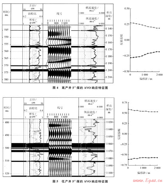 結果發(fā)現(xiàn):①高產(chǎn)井5#煤層的頂板反射界面對應的是地震剖面的負同相軸,反射振幅隨偏移距的增加而減小,呈現(xiàn)較強的負截距、正梯度異常;底板反射界面對應的是地震剖面的正同相軸,其反射振幅也隨偏移距的增加而減小,但呈現(xiàn)較強的正截距、負梯度異常。此結果證明高產(chǎn)井的儲層一般能夠形成較強的AVO異常(圖4)。②低產(chǎn)井5#煤層儲層頂、底板反射界面分別對應地震剖面的負同相軸和正同相軸,但正、負同相軸的反射振幅基本上不隨偏移距的變化而變化,幾乎無AVO異常或AVO異常很弱(圖5)。