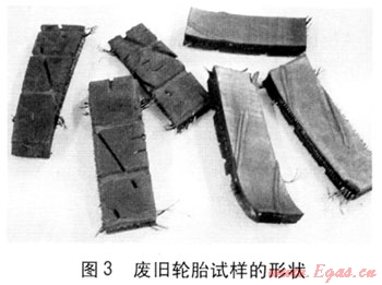 實(shí)驗(yàn)樣品來(lái)自天津市某汽車(chē)修理廠的夏利牌轎車(chē)的廢舊輪胎,型號(hào)為165/70R 13 79T,廢舊輪胎(含鋼絲和簾布)被切割成大約為7cm×3cm的長(zhǎng)塊,見(jiàn)圖3。