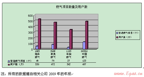目前在國內(nèi)的燃?xì)馐袌錾希饕兴募掖笮偷娜細(xì)饧瘓F,項目分布在中國大陸的各個城市,他們分別是華潤燃?xì)猓ü善贝a11933)、新奧燃?xì)猓ü善贝a2688)、中國燃?xì)?股票代碼00384)和港華燃?xì)猓ü善贝a1083),燃?xì)忭椖繑?shù)量及用戶數(shù)見下表: