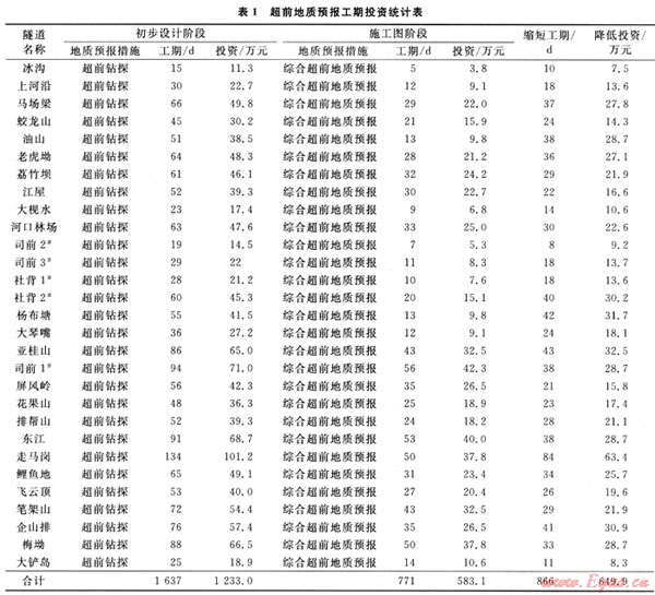 在保證工程安全的情況下,對比初步設計和施工圖設計,西氣東輸二線隧道工程初步設計階段采用單一的超前鉆探進行地質預報,初步設計階段實施超前地質預報措施的工期及投資見表1;西氣東輸二線隧道工程施工圖設計階段采用綜合超前地質預報,施工圖設計階段實施綜合超前地質預報措施的工期及投資見表1[9~12]。