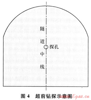 該方法屬于施工過程中的短距離地質預報方法,需要采用超前鉆孔進行驗證。由于西氣東輸二線隧道斷面較小,沿掌子面打超前水平探孔1個。超前鉆探示意圖如圖4所示。