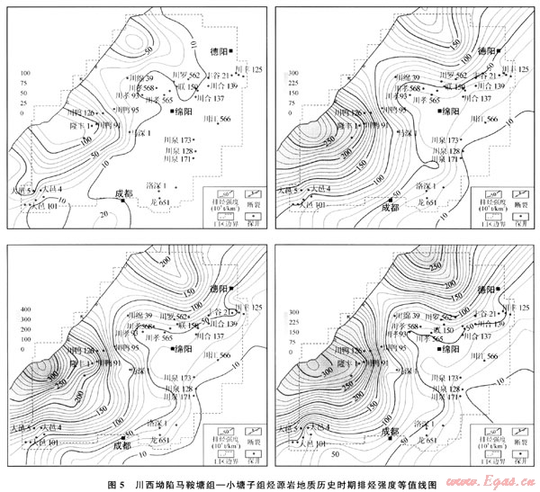 3) 排烴速率指單位體積烴源巖埋深增大100m期間排出烴量,10g/100m,反映地史過(guò)程中烴源巖的供烴強(qiáng)度,最大值對(duì)應(yīng)著排烴高峰期。從特征圖可以看出,川西坳陷總的烴源巖排烴高峰對(duì)應(yīng)為埋深為4250m的時(shí)期:馬鞍塘組一小塘子組為4800m的時(shí)期;須三段為3600m的時(shí)期;須五段為3700m的時(shí)期。