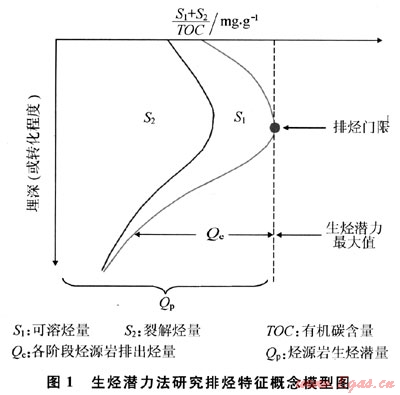 排烴門(mén)限理論在逐步完善和發(fā)展中,逐漸形成了利用生烴潛力來(lái)研究排烴門(mén)限計(jì)算排烴強(qiáng)度及排烴量的方法。生烴潛力法是根據(jù)烴源巖中的有機(jī)質(zhì)在生排烴前后質(zhì)量不變的原理,依照烴源巖的生烴潛力在沉積剖面上的變化規(guī)律來(lái)研究烴源巖排烴特征的一種方法。利用烴源巖熱解資料采用一個(gè)綜合熱解參數(shù)——生烴潛力指數(shù)[(S1+S2)/T0C]來(lái)表征烴源巖的生烴潛力。沒(méi)有油氣排出時(shí)烴源巖的生烴潛力稱為原始生烴潛力;油氣排出后,生烴潛力逐漸減小,稱此時(shí)的生烴潛力為剩余生烴潛力。烴源巖的生烴潛力指數(shù)在演化過(guò)程中開(kāi)始減小,表明有烴類大量排出,而開(kāi)始減小時(shí)的埋深條件代表了烴源巖的排烴門(mén)限,此時(shí)的生烴潛力指數(shù)為烴源巖的最大生烴潛力指數(shù)。烴源巖最大生烴潛力指數(shù)與剩余生烴潛力指數(shù)的差值為排烴率(qe),即烴源巖達(dá)到排烴門(mén)限后單位有機(jī)碳排出的烴量(mg/g);Qe代表了烴源巖在地質(zhì)熱演化史過(guò)程中累積排出的烴量(圖1)。