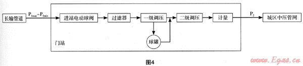 高壓球罐最高工作壓力一般為1.6MPa,長輸管道進入門站壓力若高于1.6MPa,應(yīng)設(shè)置兩級調(diào)壓系統(tǒng)。