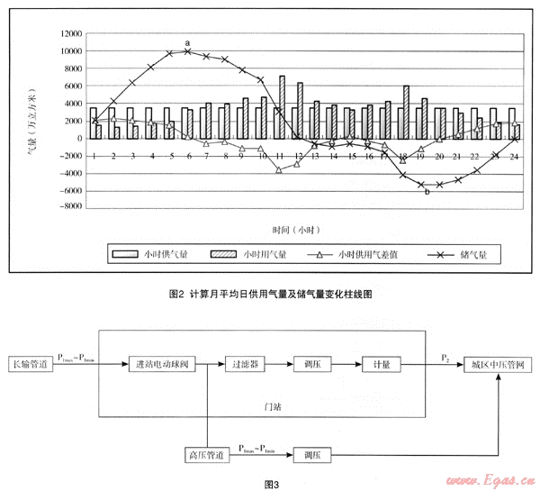 如果利用長輸管道末段儲氣,儲氣容積等于末段管路內(nèi)最高平均壓力和最低平均壓力下的氣體容積差。為保證最大的儲氣能力,長輸管道終點壓力即門站調(diào)壓器進口壓力應(yīng)降低到最小值。通常調(diào)壓器正常工作的進口最小壓力應(yīng)高于出口壓力0.05MPa。但同時調(diào)壓器進口壓力降低,其通過能力隨之降低。為避免調(diào)壓器出現(xiàn)不穩(wěn)定的情況,一般設(shè)計按照城市高峰小時流量選調(diào)壓器尺寸,無疑會加大規(guī)格或者增加并聯(lián)調(diào)壓器數(shù)量,投資隨之加大。但末端壓力最低時并不是用氣高峰階段。圖2為某城市用氣量和儲氣量變化曲線圖。