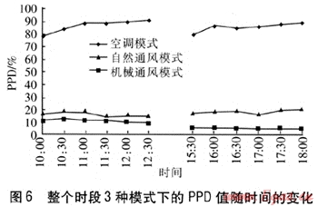 整個時段3種模式下的PPD值隨時間的變化見圖6。由圖6可知,自然通風模式下PPD值在下午時段達到20.3%;機械通風模式下除個別時刻外,大部分時間PPD值都在10%以下;空調(diào)模式下的PPD值高達80%以上。由此說明,在重慶地區(qū)過渡季節(jié)開啟空調(diào)并沒有給室內(nèi)創(chuàng)造令人滿意的熱環(huán)境。