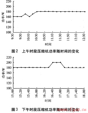 在空調(diào)模式下,工作設(shè)備主要有空調(diào)壓縮機、空調(diào)風機、加壓風機。在實驗過程中,測試開始后0.5h系統(tǒng)進入穩(wěn)定階段,采用功率表測試這3個設(shè)備的功率。上下午時段空調(diào)壓縮機功率的測試數(shù)據(jù)分別見圖2、3。由圖2、3可知,在上午時段,壓縮機的最大功率達到180W,最小功率為160W。在下午時段,最大功率達到了200W,其余時段保持在180W。