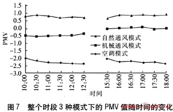 整個時段3種模式下的PMV值隨時間的變化見圖7。由圖7可知,3種模式的PMV值差別較為顯著,自然通風模式下PMV值在0.5以上;空調(diào)模式下達到-2.0以下,偏離最佳熱舒適度的程度很大;采用機械通風模式,上午時段的PMV平均值為-0.53,下午時段約為0,比上午時段更加接近最優(yōu)熱舒適度。