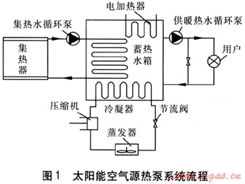 相變過程是一種伴隨有較大熱量吸收或釋放的等溫或近似等溫過程,相變潛熱一般較大,因此相變材料的蓄放熱特性在建筑供暖中有著較高的應用價值[1~6]。太陽能熱泵是太陽能熱利用技術(shù)與熱泵技術(shù)的有機結(jié)合,可提高太陽能集熱器的效率和熱泵系統(tǒng)的性能[7~9]。太陽能是可再生能源,但存在能流密度低、不均勻性、間歇性,因此利用相變材料的蓄熱能力將熱量儲存在相變蓄熱水箱中,可使太陽能熱泵系統(tǒng)保持穩(wěn)定、高效的運行狀態(tài)。本文對相變材料在太陽能熱泵系統(tǒng)中的應用進行探討。