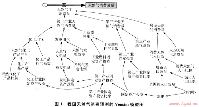 天然氣消費是一個復(fù)雜的非線性系統(tǒng),影響因素眾多。目前大多數(shù)以計量模型為基礎(chǔ)的預(yù)測方法只能考慮到兩到三方面的影響因素[1~6]。為了能夠更準(zhǔn)確地預(yù)測我國天然氣消費量,本文采取系統(tǒng)動力學(xué)的方法,利用能夠考慮多因素的Vensim系統(tǒng)動力學(xué)軟件進(jìn)行建模預(yù)測。在構(gòu)建天然氣消費預(yù)測模型時,從國民經(jīng)濟(jì)的產(chǎn)業(yè)結(jié)構(gòu)入手,將天然氣消費系統(tǒng)分為第一產(chǎn)業(yè)天然氣消費量、第二產(chǎn)業(yè)天然氣消費量、第三產(chǎn)業(yè)天然氣消費量以及居民生活天然氣消費量4個子系統(tǒng)。同時,考慮到整個社會的經(jīng)濟(jì)發(fā)展水平以及人口數(shù)量對天然氣消費量的直接影響,將GDP和全國人口數(shù)量作為預(yù)測我國天然氣消費量的重要因素。我國天然氣消費的系統(tǒng)動力學(xué)預(yù)測模型如圖1所示。