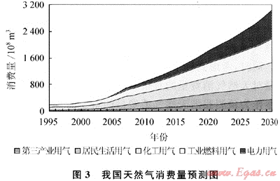 第二產(chǎn)業(yè)仍是天然氣消費的主體,雖然在2010~2015年間由于居民生活用氣和第三產(chǎn)業(yè)用氣的迅速增長使其比例有所降低,但一直占消費總量的70%以上。預(yù)測顯示,天然氣化工用氣依然保持增長,2020年將達(dá)到488.9×108m3,2030年將達(dá)到689.4×108m3,年均增長4.5%,但由于天然氣化工投資風(fēng)險大、成本高、產(chǎn)業(yè)鏈短、效益低,未來不會大規(guī)模建設(shè),因而增長速度逐步放緩。這使化工用氣比例逐漸下降,2020年降為26.7%,2030年降為22.8%。發(fā)電用氣增長速度最快,年均增長11.5%;2020年達(dá)到381.3×108m3,占天然氣消費總量的20.8%;2030年達(dá)到864.4×108m3,比例上升為28.6%。天然氣發(fā)電具有效率高、建設(shè)周期短、設(shè)備運行靈活、環(huán)境污染低等諸多優(yōu)點,但是根據(jù)我國2007年頒布的《天然氣利用政策》,目前我國天然氣發(fā)電將主要用于調(diào)峰電站。工業(yè)燃料用氣在2020年將達(dá)到432.0×108m3,2030年將達(dá)到707.3×108m3,年均增長5.9%;雖然絕對數(shù)量不小,但其在天然氣消費總量中的比例一直在緩慢降低,2020年為23.6%,2030年為23.4%,這與未來我國工業(yè)化程度逐步加深,經(jīng)濟(jì)發(fā)展趨緩是密不可分的。