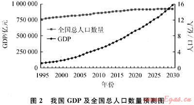 在所建立的系統(tǒng)動力學(xué)模型中,GDP與總?cè)丝跀?shù)量是預(yù)測我國天然氣消費的重要因素。在進(jìn)行各個子系統(tǒng)天然氣消費預(yù)測時,必須首先掌握這兩個因素的變化規(guī)律。根據(jù)國務(wù)院發(fā)展研究中心對我國經(jīng)濟(jì)增長前景的預(yù)測以及國家人口和計劃生育委員《國家人口發(fā)展戰(zhàn)略研究報告》的基本判斷,我國GDP的總量和未來全國總?cè)丝跀?shù)量預(yù)測結(jié)果如圖2所示。為了便于計算和對比,GDP以2005年不變價格計算。