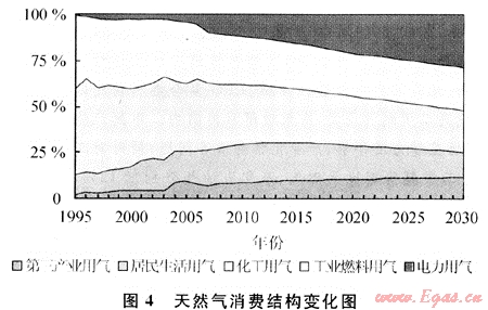 目前我國天然氣消費主體為化工用氣與工業(yè)燃料用氣,發(fā)電用氣、第三產(chǎn)業(yè)用氣以及居民生活用氣的比例相對較小。隨著天然氣消費總量的增長,消費結(jié)構(gòu)也將發(fā)生很大的變化,如圖4所示。