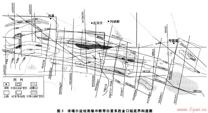 通過(guò)對(duì)基準(zhǔn)面統(tǒng)一處理后的資料進(jìn)行連片解釋及變速成圖,獲得的成果圖構(gòu)造形態(tài)自然,無(wú)畸變現(xiàn)象(圖3),且欲鉆井吻合較好。地質(zhì)成果進(jìn)一步查明了南緣沖斷帶的構(gòu)造圈閉形態(tài)、斷裂展布特征;重新落實(shí)了安集海構(gòu)造、霍爾果斯構(gòu)造、瑪納斯構(gòu)造、吐谷魯構(gòu)造、呼圖壁構(gòu)造、東灣構(gòu)造的構(gòu)造形態(tài)、高點(diǎn)位置、圈閉規(guī)模;新發(fā)現(xiàn)了霍爾果斯下盤構(gòu)造、瑪納斯下盤構(gòu)造、吐谷魯下盤構(gòu)造和瑪北構(gòu)造。通過(guò)構(gòu)造圈閉評(píng)價(jià),指明了瑪納斯構(gòu)造、吐谷魯構(gòu)造、呼圖壁構(gòu)造為該區(qū)油氣勘探的最有利的鉆探目標(biāo)區(qū),同時(shí)瑪北構(gòu)造和安集海構(gòu)造為該區(qū)次一級(jí)的油氣勘探的鉆探目標(biāo)區(qū),并提供了3口建議井位,為南緣地區(qū)的勘探開發(fā)提供了重要的基礎(chǔ)資料,對(duì)南緣沖斷帶下步勘探部署具有指導(dǎo)意義,效果顯著。