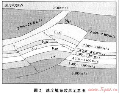 2) 以解釋好的層位及斷層為邊界條件,合理布設(shè)速度控制點(diǎn),將層速度填充在控制點(diǎn)上,速度值由速度平面圖讀出,其變化范圍、變化梯度與速度平面圖上變化一致。