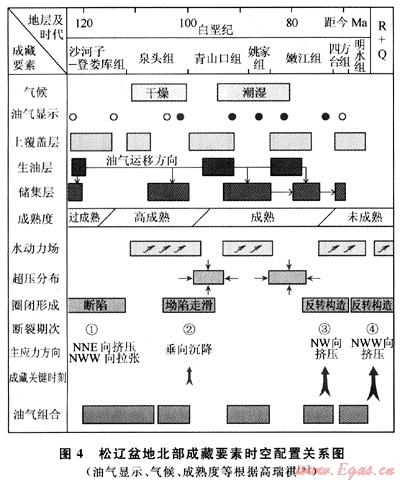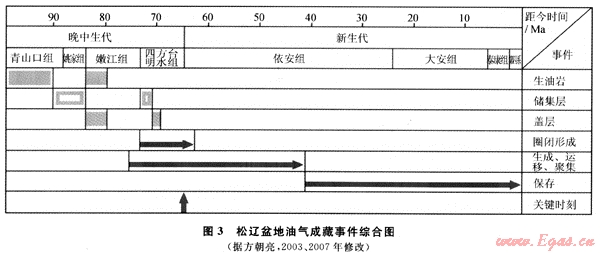 1) 松遼盆地晚期各種成藏要素在時(shí)間上和空間上形成了良好的配置關(guān)系,這為油氣在淺部地層成藏提供了基本的條件,淺層油氣是沿?cái)鄬酉蛏线\(yùn)移的結(jié)果。確定晚期成藏調(diào)整的關(guān)鍵時(shí)刻是明水期-依安期末。