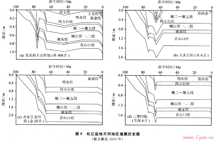 埋藏史研究結(jié)果表明,松遼盆地北部從青山VI沉積開(kāi)始,不同地區(qū)的埋藏史有所差異(圖5),正是這種埋藏歷史的差異是導(dǎo)致松遼盆地北部油氣聚集成藏的主要?jiǎng)恿W(xué)原因之一。