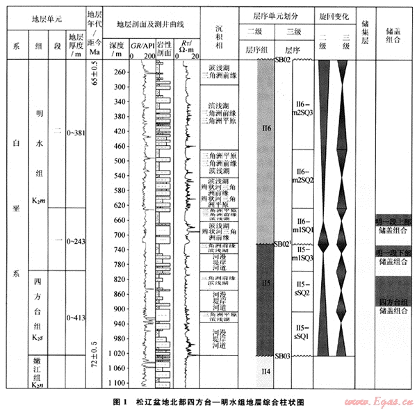 松遼盆地在演化過(guò)程中經(jīng)歷了不同的構(gòu)造運(yùn)動(dòng)期次,不同的期次發(fā)育不同的沉積特征,在松遼盆地晚期四方臺(tái)組和明水組總體以氧化-半還原環(huán)境為主,在平面上以廣闊的泛濫平原、淺水湖泊三角洲和濱淺湖相為主,四方臺(tái)組初期發(fā)育的泛濫平原河道可以作為有效的儲(chǔ)集層,另外四方臺(tái)組晚期和明水初期所發(fā)育的濱淺湖泥質(zhì)沉積可作為上覆蓋層,同時(shí)配合下伏的生油巖、斷裂輸導(dǎo)通道、有效圈閉和油氣運(yùn)聚保存的空間配置關(guān)系,可以構(gòu)成良好的成藏組合(圖3)。