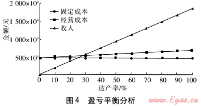 盈虧平衡分析主要是測(cè)算項(xiàng)目投產(chǎn)后盈虧平衡點(diǎn)(BEP),以考察項(xiàng)目對(duì)風(fēng)險(xiǎn)的承受能力。圖4為該項(xiàng)目的盈虧平衡分析,分析了固定成本、經(jīng)營(yíng)成本、收入和達(dá)產(chǎn)率的關(guān)系。從圖4可以看出,在達(dá)產(chǎn)率為28%時(shí),收支相抵,當(dāng)達(dá)產(chǎn)率超過28%時(shí),就可以實(shí)現(xiàn)贏利。