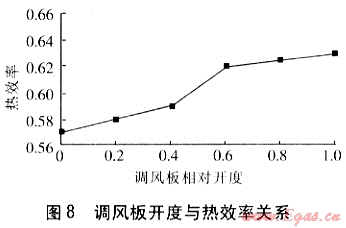 通過(guò)增大調(diào)風(fēng)板相對(duì)開(kāi)度,增大過(guò)??諝庀禂?shù),使天然氣完全燃燒,提高熱效率。