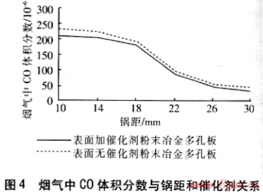 當(dāng)鍋距較小時(shí),粉末冶金多孔板表面溫度較低,造成CO向CO2的轉(zhuǎn)化率降低。鍋距增大,粉末冶金多孔板表面溫度升高,并且二次空氣供給也越充分,因此燃燒就越完全,CO生成量減少。故煙氣中CO生成量隨著鍋距增大而減少。