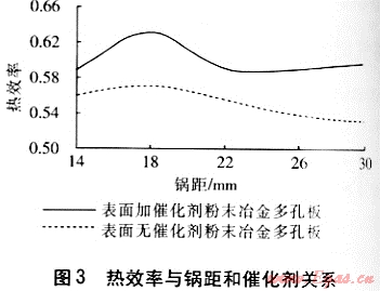 從圖3可以看出,粉末冶金多孔板在表面加催化劑時(shí)燃燒熱效率高于不加催化劑時(shí),因此表面加催化劑是必要的。當(dāng)鍋距較小時(shí),鍋底部離粉末冶金多孔板很近,鍋底溫度較低,降低了粉末冶金多孔板表面燃燒溫度,從而造成了不完全燃燒,降低了熱效率;隨著鍋距的增大,粉末冶金多孔板的表面溫度升高,熱效率升高,在鍋距為18mm時(shí)達(dá)到最大;隨著鍋距的進(jìn)一步增大,鍋底距離粉末冶金多孔板的距離太大,導(dǎo)致紅外線(xiàn)向周?chē)臻g輻射增多,紅外線(xiàn)的熱損失增大,熱效率降低。