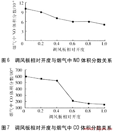 調(diào)風(fēng)板相對(duì)開(kāi)度變大,過(guò)??諝庀禂?shù)逐漸增大,煙氣中NO生成量逐漸減少。當(dāng)調(diào)風(fēng)板相對(duì)開(kāi)度≤0.4時(shí),空氣量嚴(yán)重不足,導(dǎo)致天然氣燃燒不充分,煙氣中CO生成量很高。在調(diào)風(fēng)板全開(kāi)時(shí),空氣充足,煙氣中CO得以充分燃燒轉(zhuǎn)化為CO2,煙氣中CO體積分?jǐn)?shù)降低。