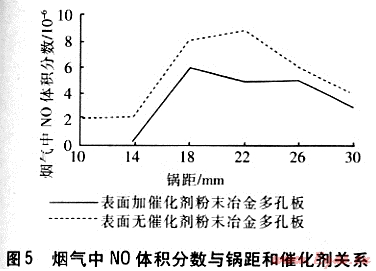 煙氣中NO體積分?jǐn)?shù)與鍋距和催化劑關(guān)系見(jiàn)圖5。從圖5可以看出,在調(diào)節(jié)的鍋距范圍內(nèi),煙氣中NO生成量很低。特別是在鍋距為10~14mm時(shí),由于鍋底溫度低,抑制了NO生成,表面加催化劑的粉末冶金多孔板的煙氣中NO體積分?jǐn)?shù)為0。