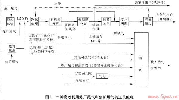 許多城市的煉油廠都與燃?xì)馍a(chǎn)企業(yè)為鄰,甚至雙方已經(jīng)形成了良好的合作關(guān)系,附近有城市燃?xì)夤芫W(wǎng),鋼鐵生產(chǎn)企業(yè)也可能與此距離不遠(yuǎn)。照此看來,如果能將鋼鐵企業(yè)、石化企業(yè)與燃?xì)馄髽I(yè)聯(lián)合起來,在兼顧各方利益的前提下,采用經(jīng)濟(jì)的方式首先提取煉廠尾氣和焦?fàn)t煤氣中的氫氣組分就近利用,之后將其他所有剩余氣體經(jīng)過簡(jiǎn)單處理后制成符合要求的代天然氣產(chǎn)品供應(yīng)城市燃?xì)夤芫W(wǎng),那么,聯(lián)合體各方就會(huì)各得其所,實(shí)現(xiàn)優(yōu)勢(shì)互補(bǔ),互利互惠。在合作各方獲取效益的基礎(chǔ)上,同時(shí)使能源利用價(jià)值達(dá)到最高化,圓滿解決煉廠尾氣和焦?fàn)t煤氣中各組分物盡其用的問題。