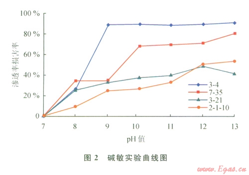 堿敏性是指具有堿性(pH值大于7)的工作液進入儲層后,與儲層巖石或流體接觸而發(fā)生反應(yīng)生成沉淀,堵塞孔喉使儲層滲透能力下降的現(xiàn)象。
