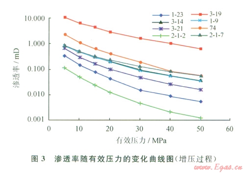 實驗分別進行了增壓過程和降壓過程的測試,增壓過程凈圍壓設(shè)置依次為5 MPa、10 MPa、15 MPa、20MPa、30 MPa、40 MPa、50 MPa,每一個圍壓保持30min后,測定巖心氣體滲透率;到最大壓力50 MPa以后,開始進行降壓過程測試,緩慢減小圍壓,使凈圍壓依次降為40 MPa、30 MPa、20 MPa、15 MPa、10 MPa、5 MPa,每一個圍壓點保持60 min后,測定設(shè)定凈圍壓下的巖心滲透率。