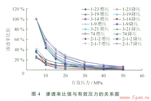 隨有效壓力的增大,巖樣滲透率急劇下降,下降幅度很大(圖3),尤其是在低壓力區(qū)間。以第一個壓力點(5 MPa)的滲透率為初始滲透率,計算不同有效壓力下滲透率與初始滲透率的比值——滲透率比,對全部實驗數(shù)據(jù)進行分析可以看出,當(dāng)有效壓力由5 MPa增大到20 MPa時,滲透率下降為初始值的ll.0%~29.4%,平均為20.2%,即滲透率下降了約4/5;當(dāng)有效壓力增大到50 MPa時,滲透率下降為初始值的1.10%~7.04%,平均為3.73%,即剩余滲透率都低于10%,表明滲透率的下降幅度非常大,應(yīng)力敏感性強。