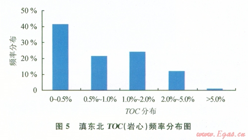 巖心樣品分析揭示,黑色巖系TOC值變化范圍廣,而且下部總體較上部高。本次研究共測(cè)試了9口井的506塊樣品的總有機(jī)碳含量。TOC (巖心)介于0.02%~9.37%之間,平均為0.97%,TOC頻率劃分為5個(gè)區(qū)間(圖5),其中,0<TOC<0.5%頻率最高(占41.26%),0.5%<TOC<1%占21.52%,l%<TOC<2%占24.22%,2%<TOC<5%占l2.11%,TOC>5%占0.9%。需要說(shuō)明的是,烴源巖中有機(jī)碳以3種形式存在:①烴類中殘余有機(jī)碳;②轉(zhuǎn)化為烴類(可轉(zhuǎn)換碳、活性碳和不穩(wěn)定碳)(Cooles等,l986);③碳質(zhì)殘?jiān)痪呱鸁N能力,缺少轉(zhuǎn)化為烴類所需足夠的氫,通常稱為惰性碳、死碳。由于有機(jī)碳的轉(zhuǎn)化作用,所以原始有機(jī)質(zhì)含量比現(xiàn)今殘余有機(jī)碳含量高(TOC),有20%[7]~36%的差值。
