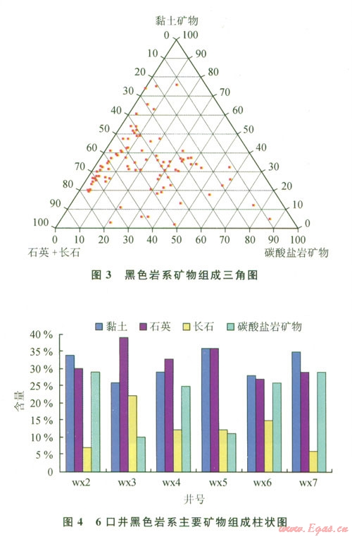 頁(yè)巖的礦物組成、有機(jī)碳含量和有機(jī)質(zhì)成熟度是頁(yè)巖儲(chǔ)層發(fā)育的3個(gè)最重要因素。滇東北黑色巖系頁(yè)巖礦物成分統(tǒng)計(jì)表明(圖3、4),6口井(wx2、wx3、wx4、wx5、wx6、wx7)黑色巖系黏土礦物含量平均值分別為34%(4%~55%)、26%(5%~40%)、29%(2%~65%)、36%(12%~53%)、28%(20%~36%)、35%(3%~82%);石英含量平均值分別為30%(2%~39%)、39%(9%~50%)、33%(24%~51%)、36%(11%~52%)、27%(14%~34%)、29%(10%~65%);長(zhǎng)石平均含量分別為7%(2%~l5%)、22%(2%~32%)、12%(3%~27%)、12%(1%~26%)、15%(1%~22%)、6%(1%~l5%);碳酸鹽巖類(方解石和白云石)平均含量分別為:29%(8%~94%)、l0% (2%~86%)、25%(3%~48%)、11%(2%~74%)、26%(5%~55%)、29%(1%~58%)。頁(yè)巖中的石英呈紋層狀或分散狀分布,顆粒大小介于0.03~0