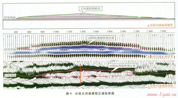 圖9是分流主河道地質(zhì)模型正演結(jié)果與實(shí)際地震剖面對比圖。圖9中顯示分流主河道因該具有“高阻抗、透鏡狀、強(qiáng)反射”地震響應(yīng)特征,與實(shí)際過井地震剖面特征一致。因此可以利用“高阻抗、強(qiáng)振幅、透鏡反射”預(yù)測分流主河道鈣屑砂巖分布。