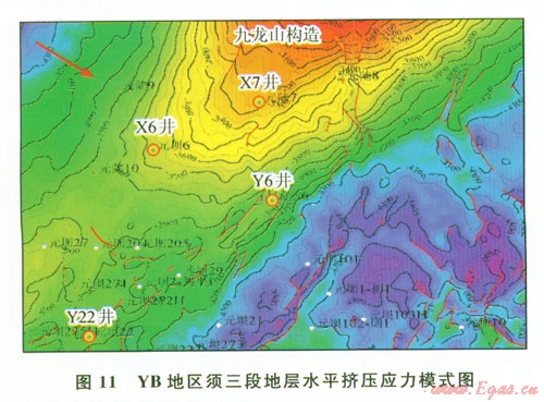 YB構(gòu)造位于四川盆地北部,地處龍門山前、米倉山前、大巴山前推覆褶皺帶交合處,具有三重構(gòu)造應(yīng)力擠壓背景。元陸7井附近地層屬于九龍山構(gòu)造西南翼斜坡帶,其構(gòu)造應(yīng)力主要來源于龍門山南東向的水平構(gòu)造擠壓應(yīng)力以及大巴山縱向擠壓造成的膏鹽巖“上拱”應(yīng)力(圖11、12)。