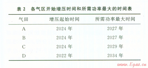 各氣區(qū)后期壓力產(chǎn)量見(jiàn)表1,增壓時(shí)間和所需功率最大時(shí)間見(jiàn)表2。根據(jù)表l2對(duì)兩個(gè)增壓方案進(jìn)行詳細(xì)論證比選。