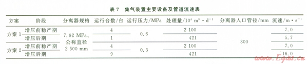 2)方案2:由于在天然氣處理廠集氣裝置集中增壓,因此,導(dǎo)致集氣裝置增壓前設(shè)備和管道的壓力工作范圍波動(dòng)很大(0372 MPa),經(jīng)核算要滿足從0372 MPa工況下氣液分離器的適應(yīng)性,需設(shè)置工作壓力為792 MPa、公稱直徑為2500 mm的臥式氣液分離器9臺(tái)。同時(shí)由于站內(nèi)管道的工作壓力范圍也是0372 MPa,這將導(dǎo)致集氣裝置增壓前管道選型非常困難。以氣液分離器進(jìn)口管道為例,前期開(kāi)啟4臺(tái)分離器,各進(jìn)口管道流速為7 ms,后期由于產(chǎn)量下降,但壓力也急劇下降至03 MPa,需開(kāi)啟9臺(tái)分離器,進(jìn)口管道流速高達(dá)l6 ms(站內(nèi)流速宜小于lO ms,以降低噪聲,減小沖刷腐蝕,確保緩蝕劑附著良好),若為降低后期管道流速,勢(shì)必增加管道管徑,又會(huì)導(dǎo)致前期流速過(guò)低,這種矛盾將十分突出,除了后期新建副管外,基本上沒(méi)有其他解決措施。不同方案集氣裝置主要設(shè)備及管道流速見(jiàn)表7。
