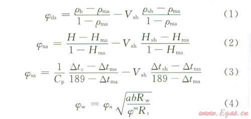 由泥質(zhì)砂巖體積模型可寫(xiě)出地層流體為淡水時(shí)地層視密度孔隙度(φda)、視中子孔隙度(φna)、視聲波孔隙度(φsa)和含水孔隙度(φw),即