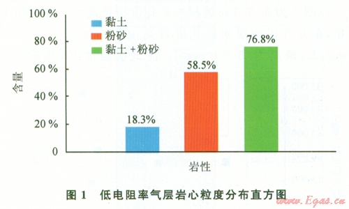 根據(jù)薄片鑒定分析和粒度分析資料,東方區(qū)塊低電阻率氣層巖性主要為由細(xì)-極細(xì)粒的石英粉砂和泥質(zhì)組成的泥質(zhì)粉砂巖。圖1為低阻氣層巖心粒度分析的黏土與粉砂含量分布直方圖,可見(jiàn)低阻氣層巖石顆粒成分主要為黏土與粉砂,二者之和約為80%。圖2為低阻氣層巖心X射線衍射分析得到的黏土礦物分布直方圖,由圖可見(jiàn),低阻氣層的黏土礦物主要為蒙脫石與伊利石,兩者的含量總和達(dá)到60%。細(xì)顆粒巖性對(duì)儲(chǔ)層電阻率的影響主要體現(xiàn)在以下兩方面:①儲(chǔ)層中細(xì)顆粒成分越多,巖石的比表面積就會(huì)越大,顆粒表附大量的束縛水,增強(qiáng)巖石導(dǎo)電性;②小巖粒含量越高,地層中小孔隙和小喉道就越發(fā)育,使巖層中殘余水(束縛水)含量急劇升高,這又增強(qiáng)了巖石導(dǎo)電性,使地層電阻率下降。由此可見(jiàn),巖性細(xì)是形成東方區(qū)塊部分氣層低電阻率特性的基本地質(zhì)環(huán)境[3-5]。